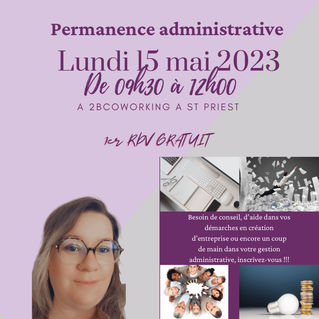 La prochaine permanence administrative se tiendra le lundi 15 mai de 09h30 à 12h00 â l’espace @2bcoworking à ST PRIEST.